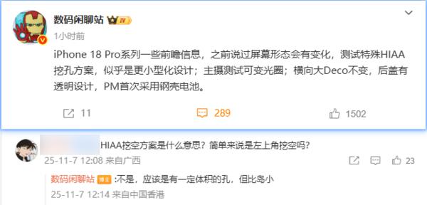 [CNMO科技消息]11月7日,根据数码博主的爆料,iPhone18Pro系列将取消“灵动岛”设计,目前正在测试HIAA挖孔方案。该博主称,HIAA方案是相比于灵动岛更小的挖孔设计。
